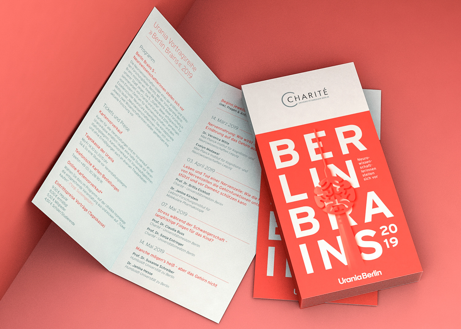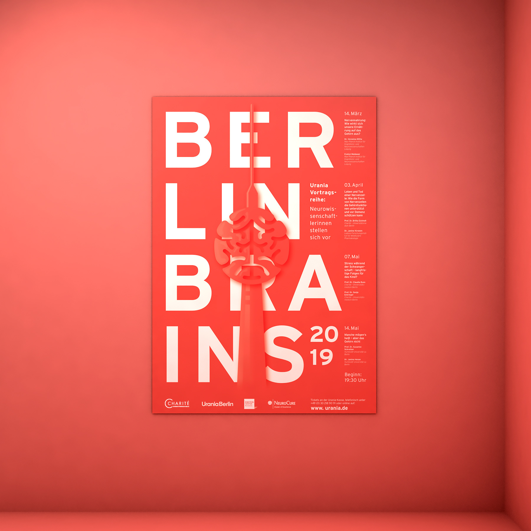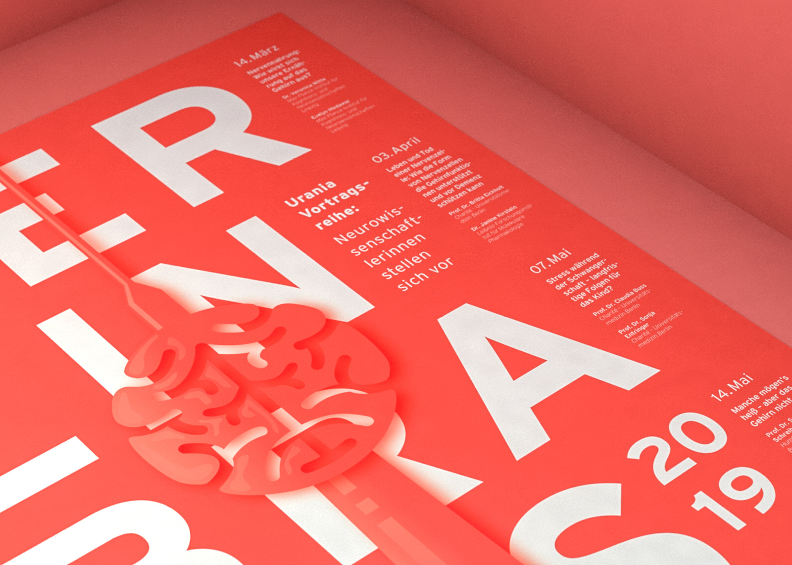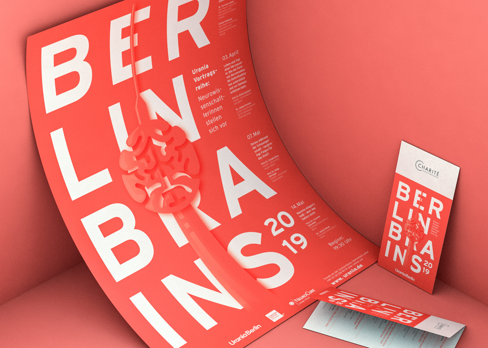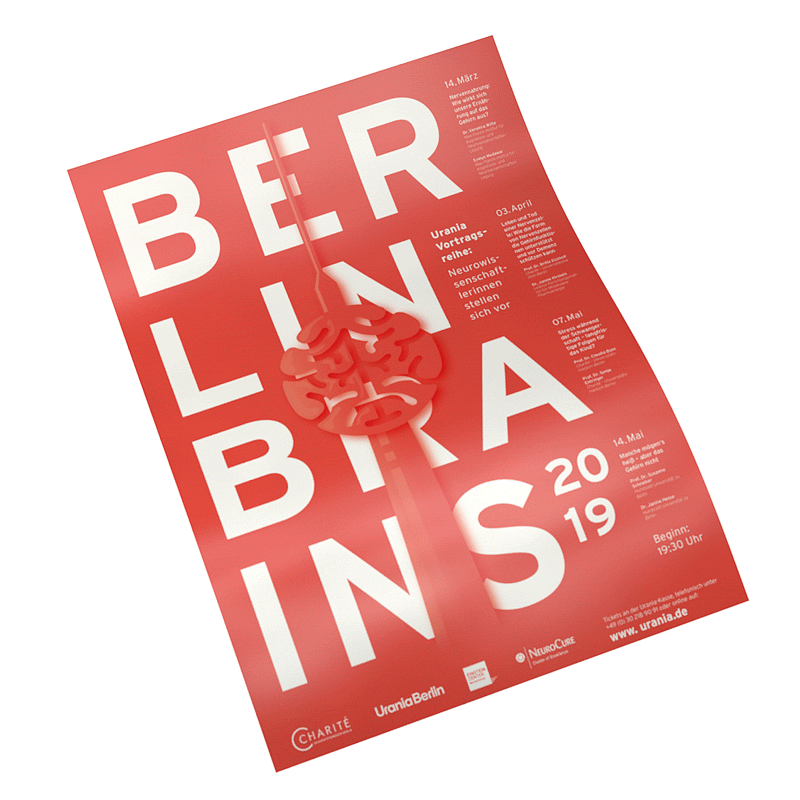 Berlin Brains is an annual neuroscience event by Charité – Universitätsmedizin Berlin, Urania Berlin, NeuroCure Cluster of Excellence and Einstein Center for Neuroscience. The event branding uses the combination of a striking bold typography and an organic, flat design illustration of the famous tv-tower with a brain body. The reduction to one key color allows a uniform appearance for the merger of the research institutions.