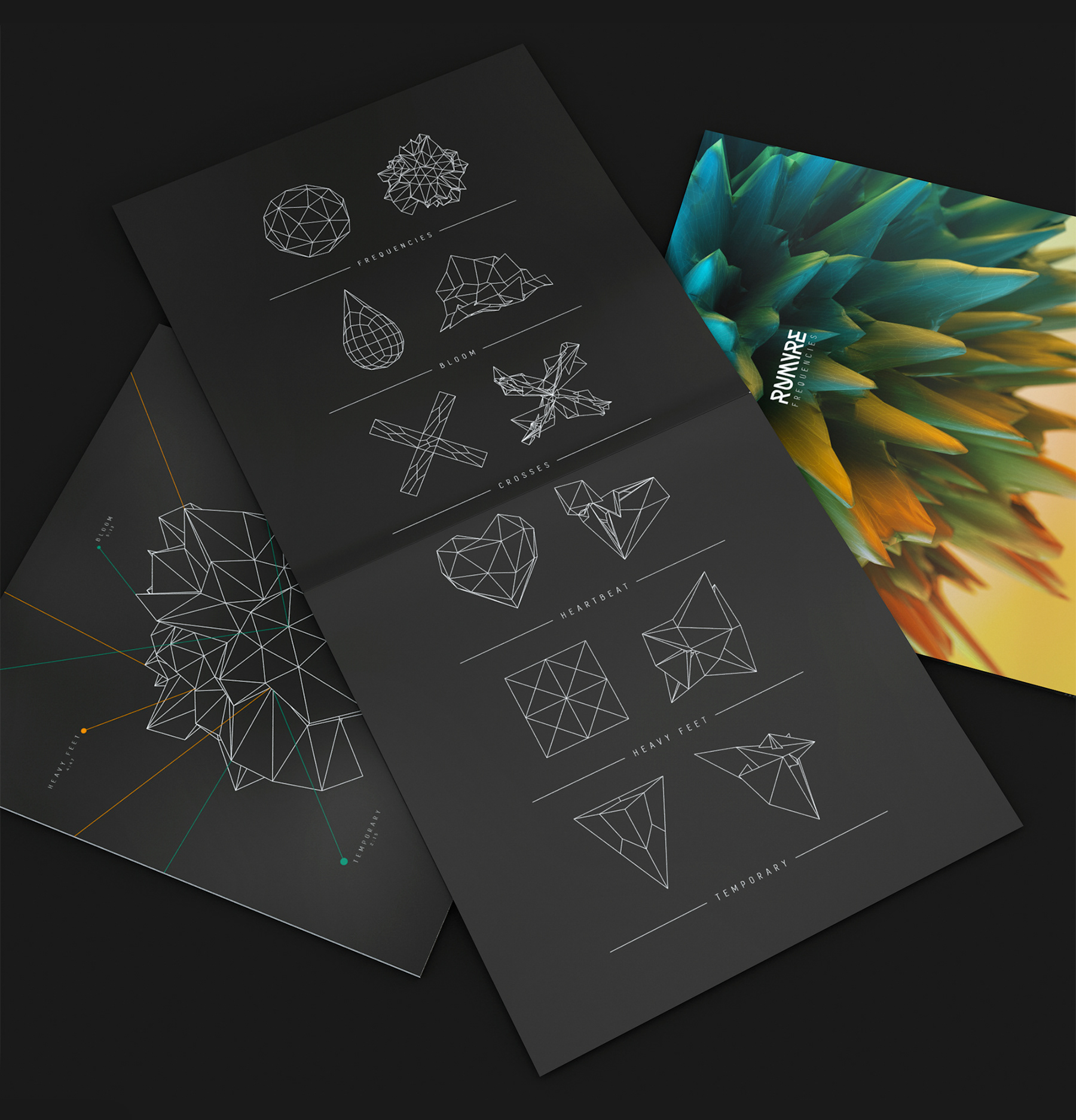 The record cover design created for his own music project shows the transformation between sound and image. The frequencies of five tracks each take a leading role in the design process. The organic shape on the front and the polygonal shape on the back of the record are transformed in the same way by all five overlapping frequencies. To create a transition from the entire album to the individual track, the polygonal form on the cover breaks into pieces. The five symbols on the insert are transformed by a single frequency of the respective track.